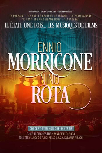 Sous la direction de Marcello Rota, chef d’orchestre de renommée internationale, les célèbres solistes Nello Salza (trompette), Ludovico Fulci (piano) et Susanna Rigacci (soprano), qui ont collaboré pendant plus de 30 ans avec Ennio Morricone avec plus de 500 concerts à travers le monde, interprètent des pièces magistrales du répertoire. Vivez les moments clés de leurs carrières exceptionnelles à travers les musiques de films de Sergio Leone (Le Bon, la Brute et le Truand, Il était une fois dans l’Ouest…), Francis Ford Coppola (Le Parrain…) ou encore Federico Fellini (La Strada).